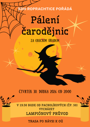 Pálení čarodějnic za obecním úřadem se uskuteční ve čtvrtek 30.dubna 2026. V 19:30 hodin bude od Pacholíkových vycházet Lampiónový průvod. Těší se na Vás pořadatelé, SDH Roprachtice.